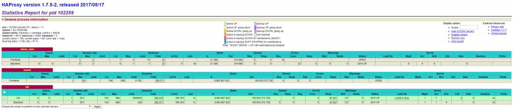| global log 127.0.0.1 local0 #[日志输出配置,所有日志都记录在本机,通过local0输出] log 127.0.0.1 local1 notice #定义haproxy 日志级别[error warringinfo debug] daemon #以后台形式运行harpoxy nbproc 1 #设置进程数量 pidfile /var/run/haproxy.pid ulimit-n 65536 #ulimit 的数量限制 #maxconn 2000000 #默认最大连接数,需考虑ulimit-n限制 #chroot /usr/local/haproxy tune.ssl.default-dh-param 2048 defaults log global mode tcp #默认的模式mode { tcphttphealth },tcp是4层,http是7层,health只会返回OK retries 3 #两次连接失败就认为是服务器不可用,也可以通过后面设置 option abortonclose #当服务器负载很高的时候,自动结束掉当前队列处理比较久的链接 option redispatch maxconn 8192 #默认的最大连接数 timeout connect 5000ms #连接超时 timeout client 50000ms #客户端超时 timeout server 50000ms #服务器超时 timeout tunnel 1h timeout client-fin 30s balance roundrobin #设置默认负载均衡方式,轮询方式 #balance source #设置默认负载均衡方式,类似于nginx的ip_hash #balnace leastconn #设置默认负载均衡方式,最小连接数 listen admin_stats bind 0.0.0.0:987 #节点统计页面的访问端口 mode http #http的7层模式 option httplog #采用http日志格式 maxconn 10 #节点统计页面默认的最大连接数 stats refresh 30s #节点统计页面自动刷新时间 stats uri /haproxy #节点统计页面url stats realm Haproxy #统计页面密码框上提示文本 stats auth admin:admin #设置监控页面的用户和密码:admin,可以设置多个用户名 stats admin if TRUE #设置手工启动/禁用,后端服务器(haproxy-1.4.9以后版本) frontend transit bind *:999 mode tcp default_backend hkt backend hkt mode tcp server hkt 1.1.1.1:80 check inter 30s rise 2 fall 3 maxconn 2000000 frontend wtt bind *:443 ssl crt /root/ssl.pem redirect scheme https if !{ ssl_fc } mode http default_backend wtt backend wtt mode http server wtt 2.2.2.2:80 check inter 30s rise 2 fall 3 maxconn 2000000