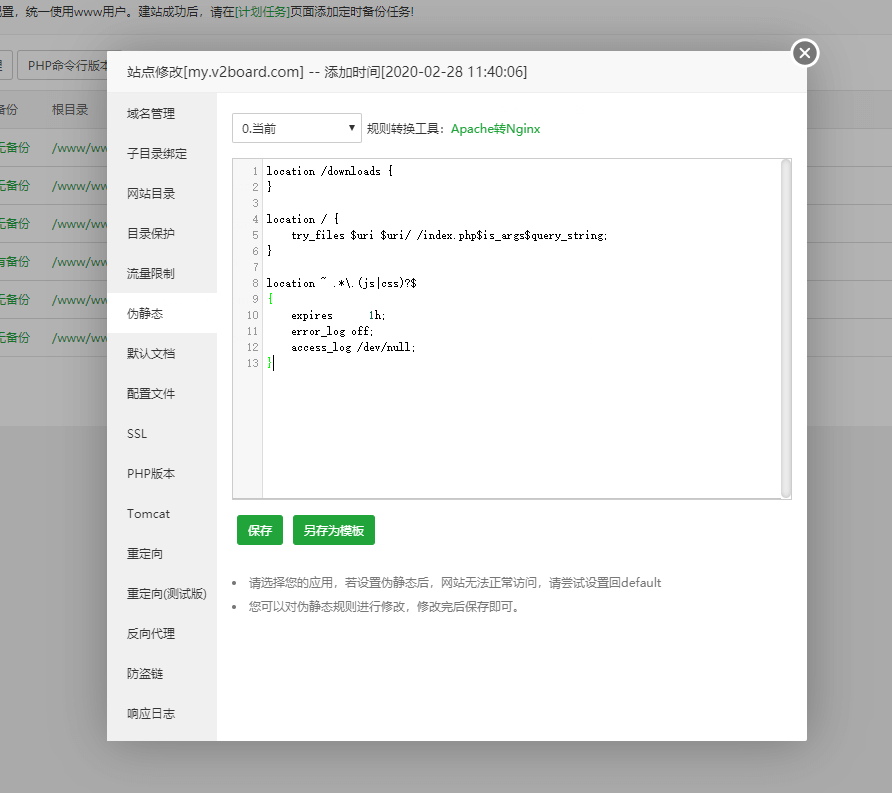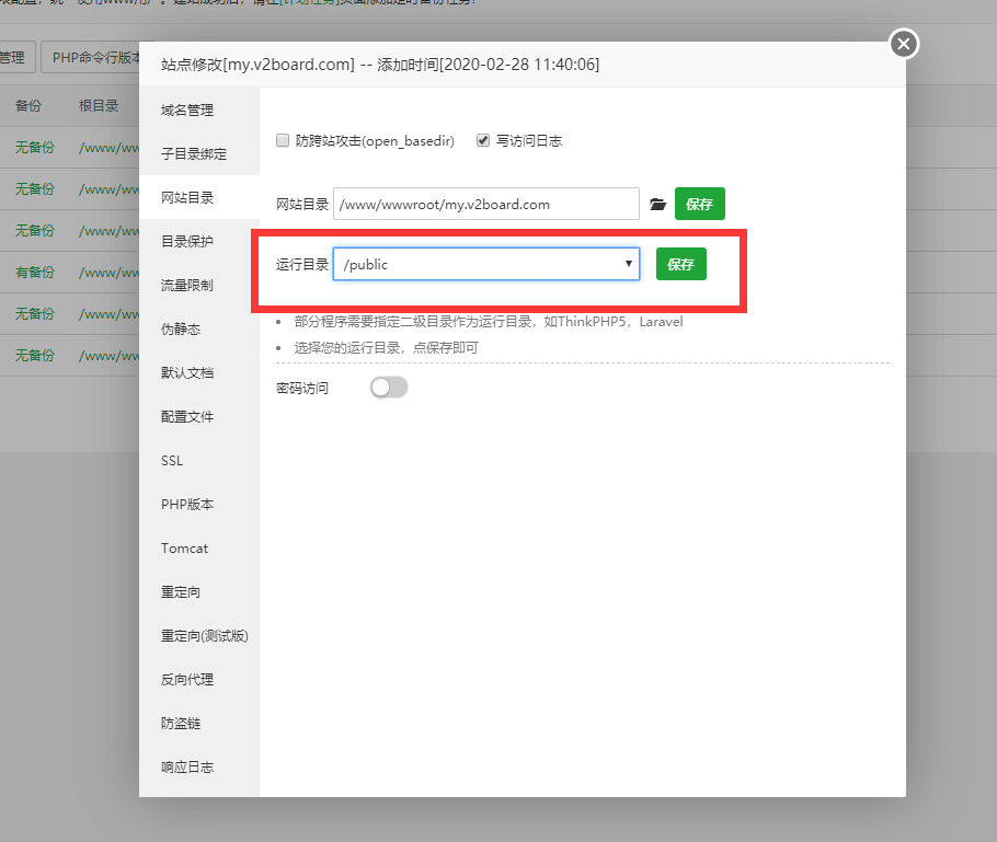 然后编辑添加的站点,网站的运行目录选择 /public 保存