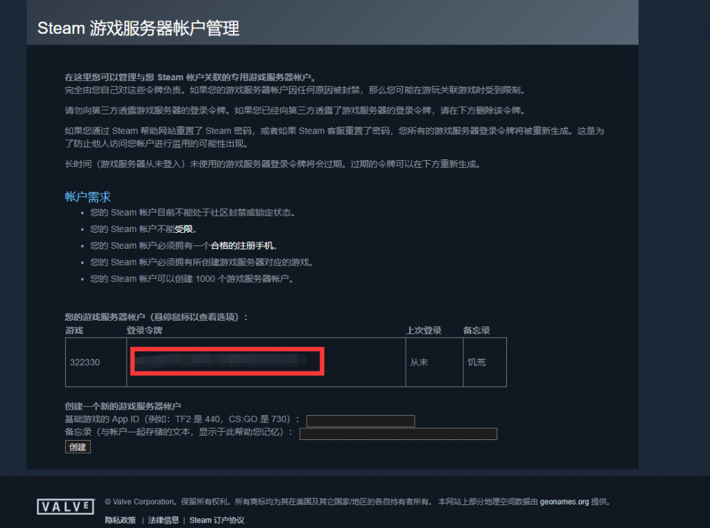 首先我们需要打开下面的网址生成一个Steam服务器令牌: