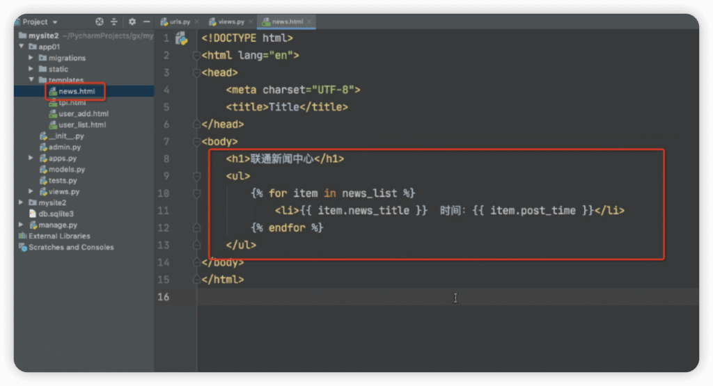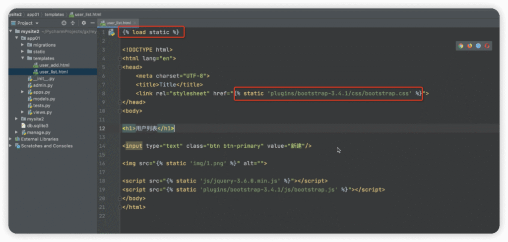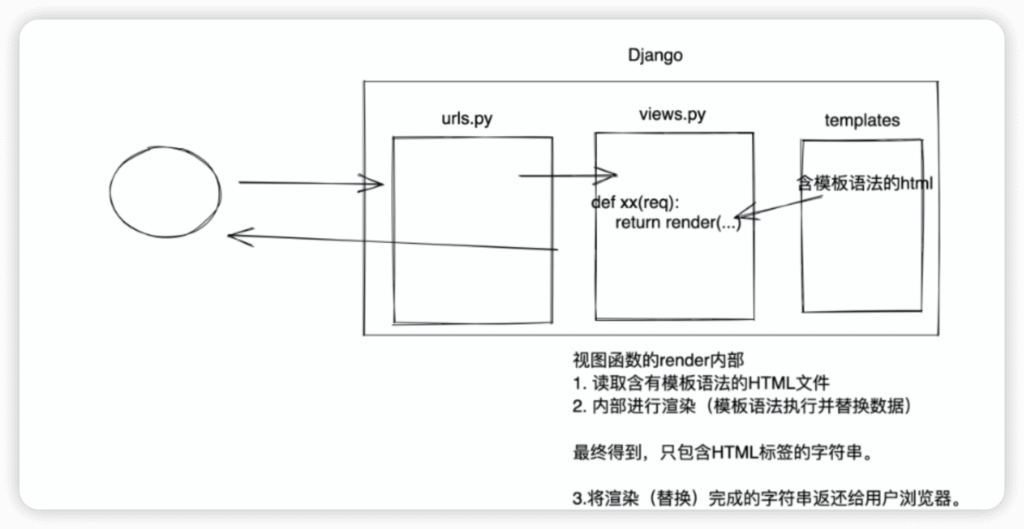 django的话,其实是view视图函数通过render读取静态文件,并将需要执行python的部分通过模版语法渲染出来,所以我们需要在html文件中通过模版语法来写入