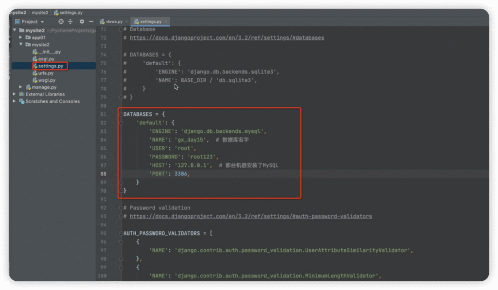 | DATABASES = { 'default': { 'ENGINE': 'django.db.backends.mysql', 'NAME': 'gx_day15', # 数据库名字 'USER': 'root', 'PASSWORD': 'root123', 'HOST': '127.0.0.1', # 那台机器安装了MySQL 'PORT': 3306, } }