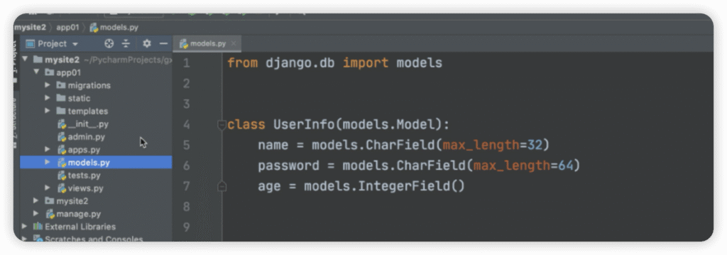 | ├── app01 │ ├── __init__.py │ ├── admin.py 【固定,不用动】django默认提供了admin后台管理。 │ ├── apps.py 【固定,不用动】app启动类 │ ├── migrations 【固定,不用动】数据库变更记录 │ │ └── __init__.py │ ├── models.py 【**重要**】,对数据库操作。 │ ├── tests.py 【固定,不用动】单元测试 │ └── views.py 【**重要**】,函数。 ├── manage.py └── mysite2 ├── __init__.py ├── asgi.py ├── settings.py ├── urls.py 【URL->函数】 └── wsgi.py