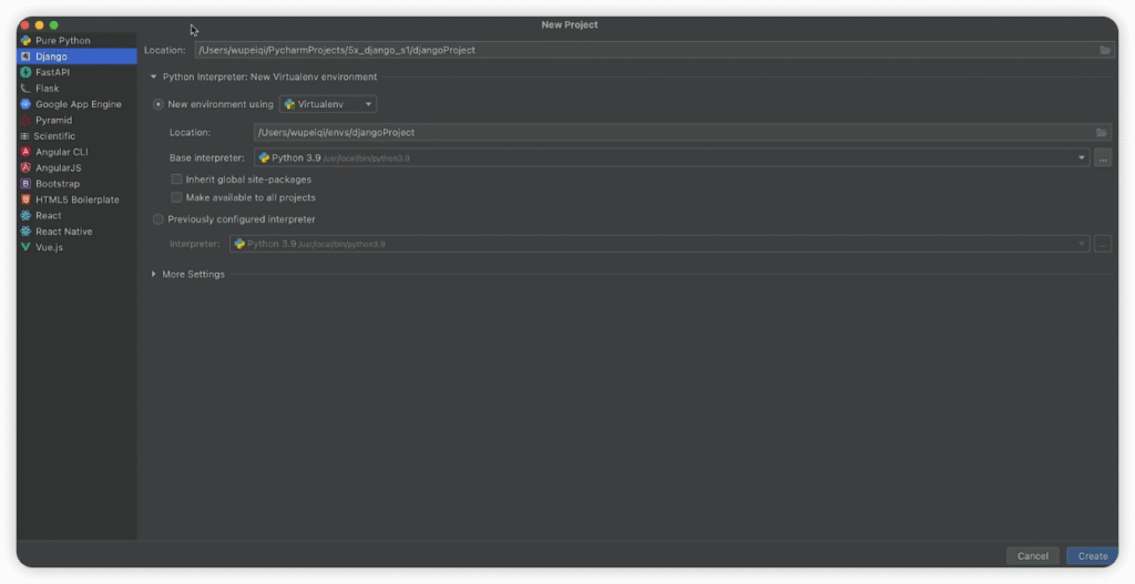 (因为笔者学习的时候要用低版本的django,实际上不需要指定django版本的话直接用pycharm创建django项目也可以,会默认创建新的版本)