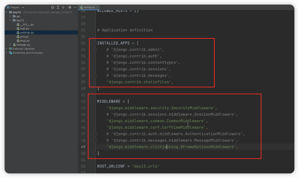 django自带了一些app和组件,这里不需要,从settings里注视掉