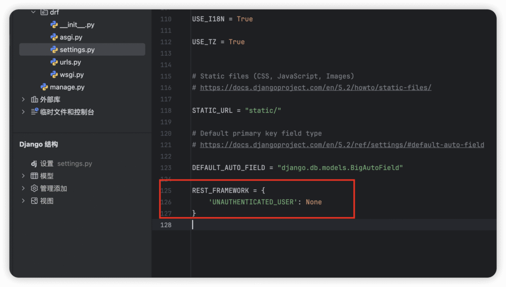 注意这里的语法,由于drf嵌套了一层,所以不能直接像修改django的设置一样写,要这样写代表修改drf设置